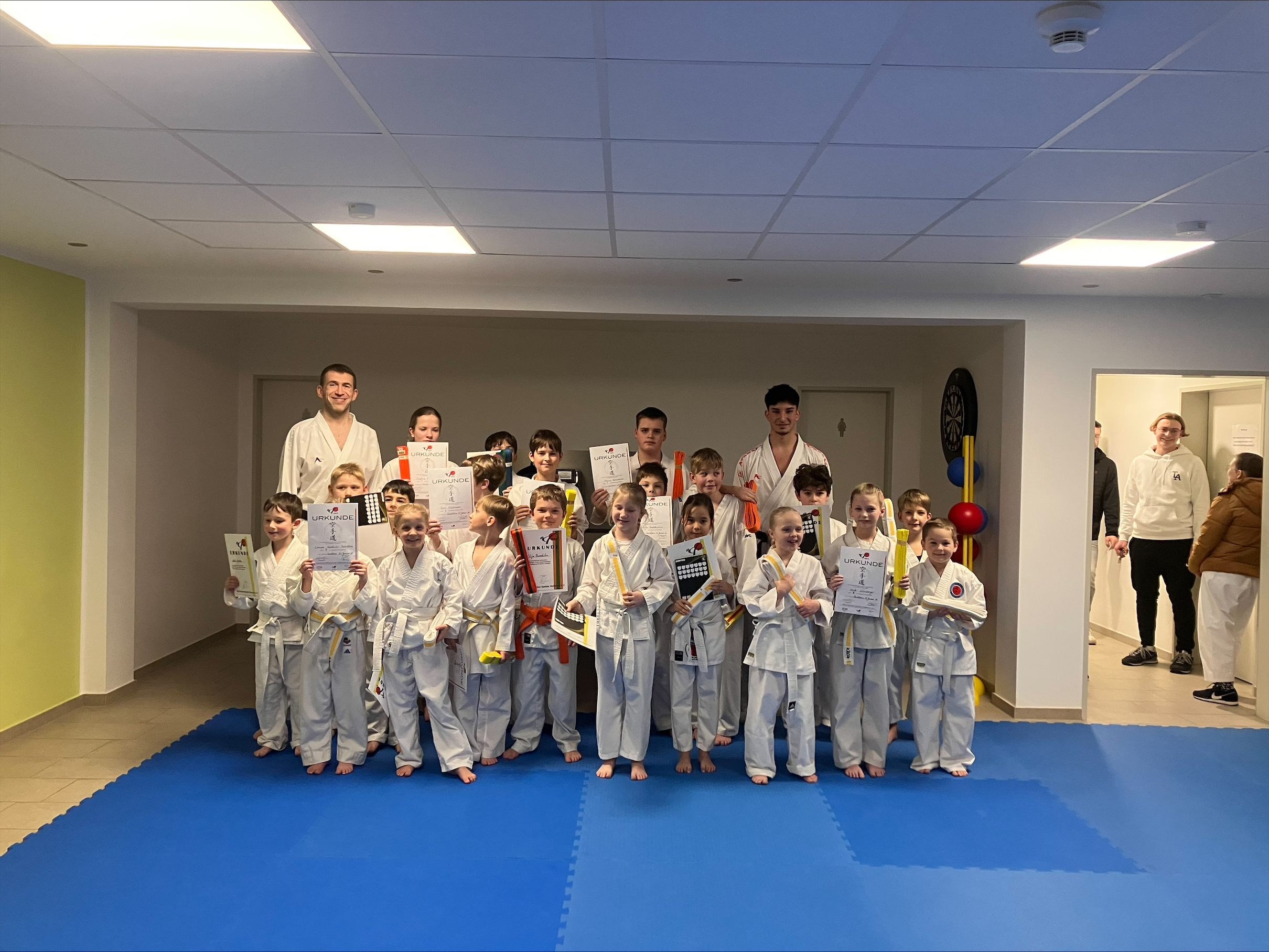 Für zehn Karatekas war dies die erste Gurtprüfung überhaupt, bei der alle erfolgreich den Schritt vom weißen zum weiß-gelben Gürtel meisterten. Für sie markierte die Prüfung den offiziellen Einstieg in ihre Karate-Laufbahn und wurde mit sichtbarem Stolz und Freude gefeiert.